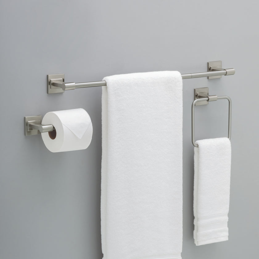 A brushed nickel bathroom accessories set typically includes essentials like a towel bar, towel ring, toilet paper holder, and robe hook - all in matching finish. Silver-toned hardware is one of the most versatile choices, pairing beautifully with almost any color palette, from cool blues and grays to warm creams and beiges.